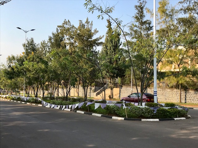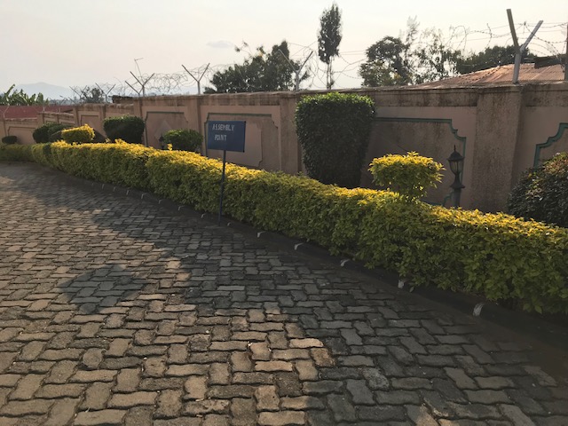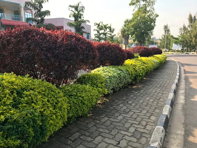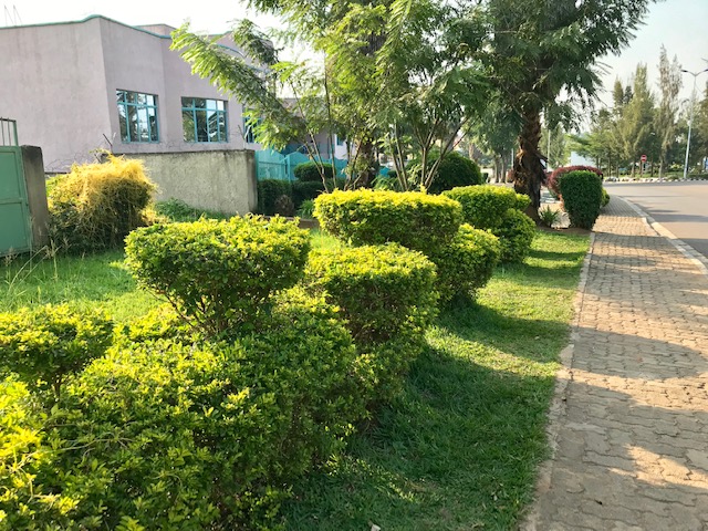 2. Landscaping – Rwandans have an eye for beauty and a knack for landscaping. Thanks to our school’s landscaping crew, our grounds always look neat and trim.  And, the town is very beautiful. There aren’t any lawn mowers anywhere, but the groundskeepers use cutlasses, edge-trimmers and electric hedge cutters to keep our tall hedges looking sharp.  The groundskeepers also continuously weed by hand in between the paving bricks of the school’s parking lots to keep the grass that constantly erupts between the bricks at bay.  With Rwanda’s heavy rainfall, everything grows like, you guessed it, weeds, so the landscaping work is never ending.